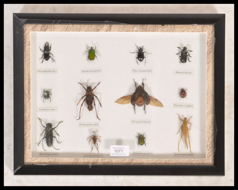 A 20th century framed and glazed mounted taxidermy collection of beetles, each beetle with name below. Measures 43cm x 33cm.