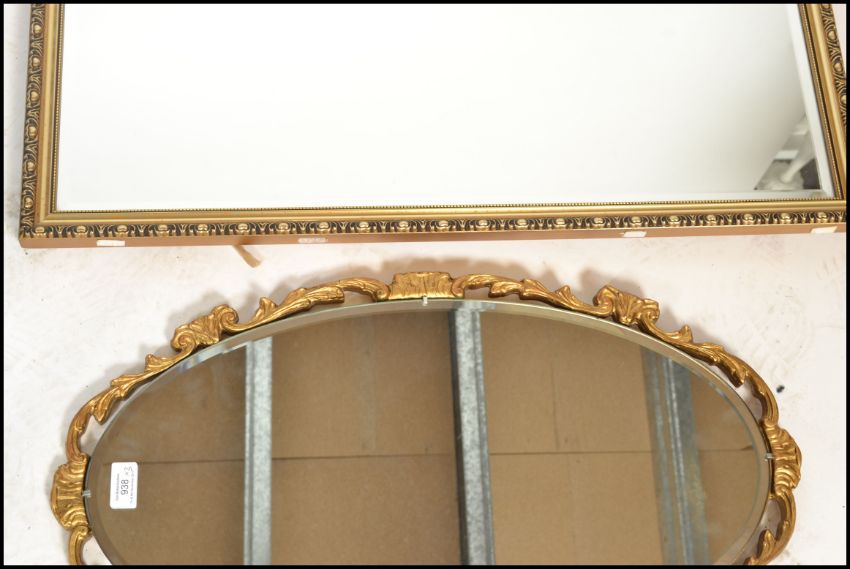 A 20th century large gilt mirror of contemporary form together with 2 further gilded 20th century mirrors, one with fret design. Measures 49cm x 81cm.