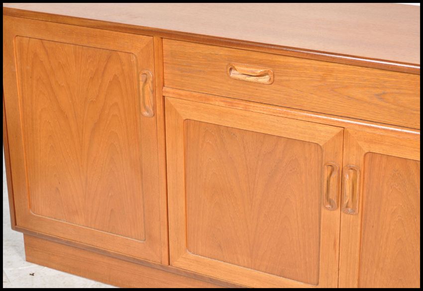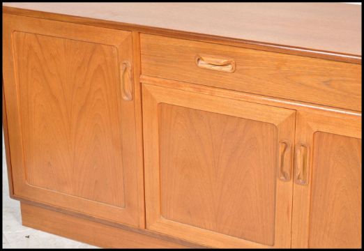A 1970's G-Plan teak wood sideboard being raised on inset plinth base comprising a wide body above with an arrangement of cupboards and drawers. All with recessed lozenge shaped handles. Measures 73cm x 186cm x 45cm.