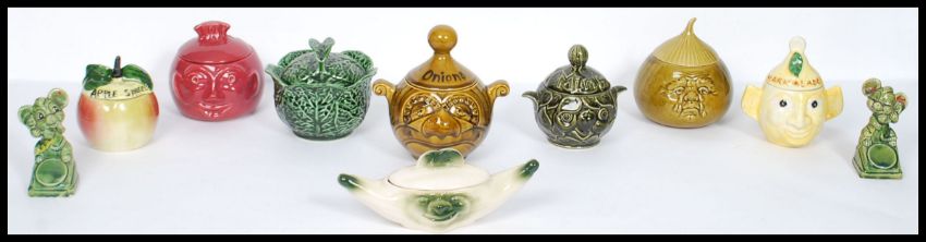 A collection of vintage 20th century ceramic condiment jars with faces to include apple sauce, mint, cabbage, onion etc. Various makers please see images. Highest measures 18 cm and widest measures 21 cm.