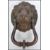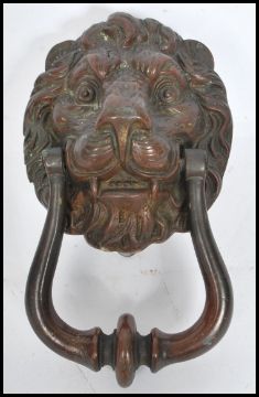An early 20th century cast iron lion mask door knocker with remnants of original paint. Measures 20 cm long.