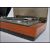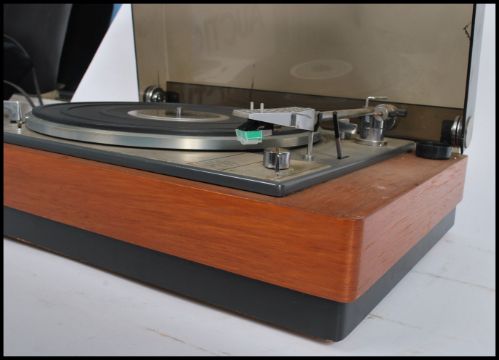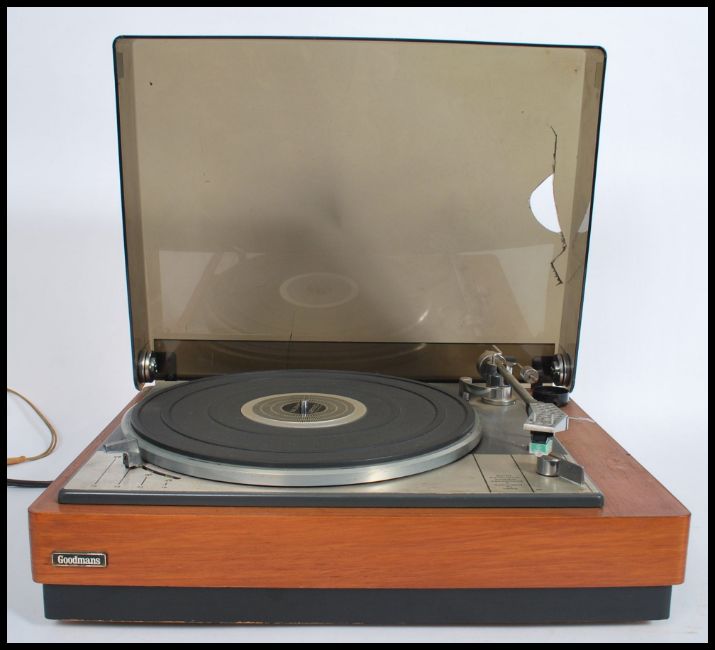 A vintage 20th century Lenco Goldring record player deck set within a teak wood Goodmans case with acryllic hood