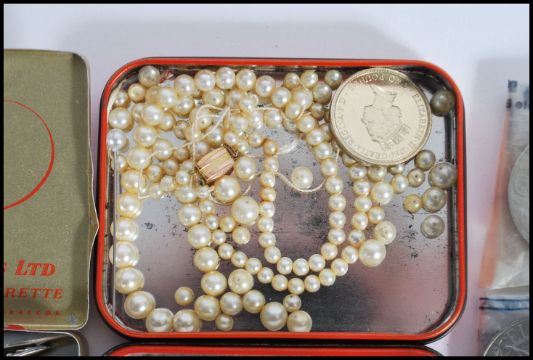 A group of vintage costume and dress jewellery to include gentleman's tie pins cuffs buttons collar studs, some 9ct gold and silver hallmarked examples, 9ct gold clasp pearl necklace, 9ct gold stick pin etc. Please see images.