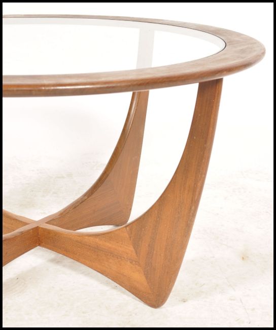 A 1970's G-plan teak model 8040 'Astro' coffee table, with inset circular glass top over stylized strut supports