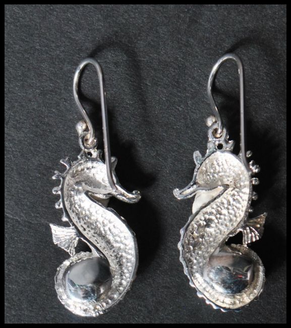 A pair of 925 silver drop earrings in the form of seahorses set with pearls having fish hook fasteners. Marked 925. Measures approx 3.5cms.
