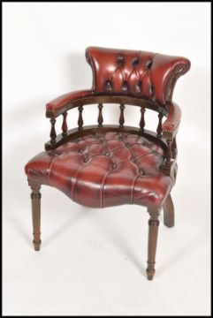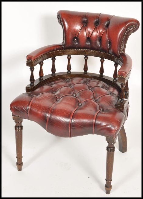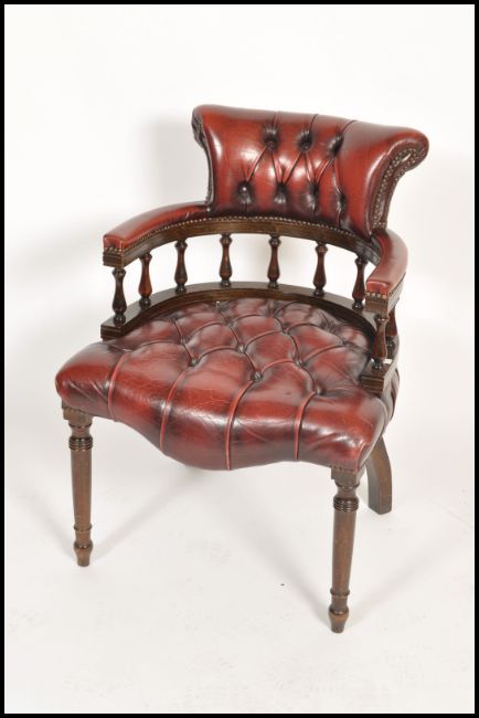 A 20th century ox blood Leather Chesterfield deep button back mahogany framed captains office desk chair having a spindle gallery back raised on turned legs. Measures 89cm x 60cm x 70cm.