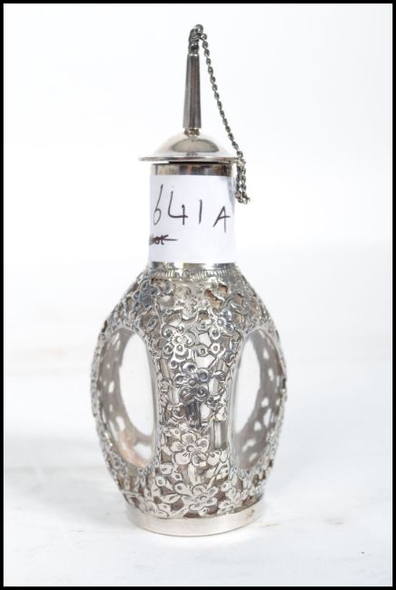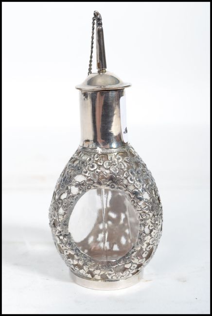 A Chinese silver perfume scent bottle having three oval glass panels. Marks to base.