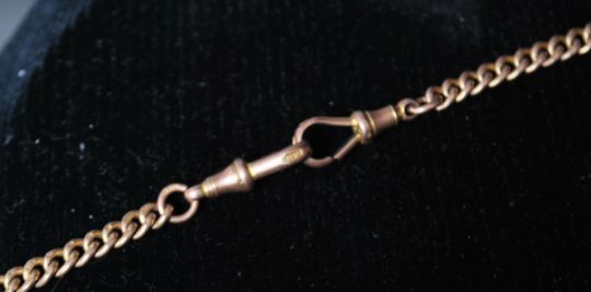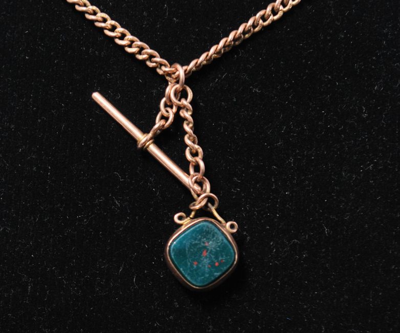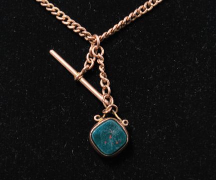 A hallmarked 9ct gold pocket watch Albert chain  having a t bar clasp with hallmarked 9ct gold intaglio fob with carnelian and green stone. Weighs 20.9 grams.
