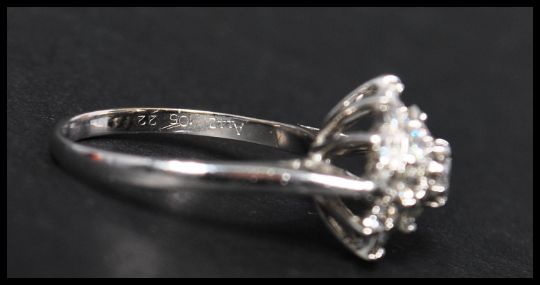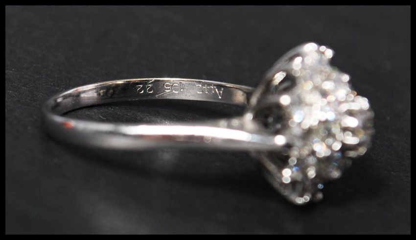 A contemporary  ladies 20th century 18ct white gold diamond cluster ring, together with valuation certificate from Nicholas Wilder. Diamond  1 stone, shape: Round brilliant. Colour: H / 1. Clarity: VS1 / VS2. ( Assesssed ) Length: 3.90mm, Width: 3.90mm, Depth: 2.40mm. Weight: 0.22ct ( Stated ) Setting   Colour: White. Type: Claw. Location: Central. Diamond   20 Stones, shape: Round Brilliant. Colour: Range ( G to J ) Clarity S12 / 11 ( Assessed ) Dimensions: From 2.40mm to 2.60mm. Setting   Colour: White. Type: Claw. Location: Cluster Shoulders   Tapered / Chenier. Metal colour: White. Finish: Polished. Shank   D.Colour: White. Finish: Polished. General   Gross Weight: 5.3 grams. Manufacture: Assembled Casting. Period: Modern. Marks: Tested. Metal Type: Gold, 18ct, Makers or sponsor: NP, other marks: A442.105, 22. Cyprus marks for 18ct gold.