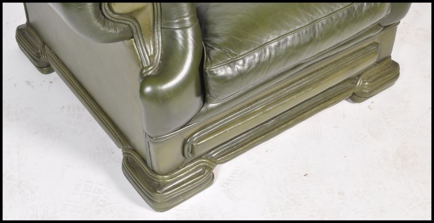 A 20th century Chesterfield green leather button back club armchair, low back with scroll arms.