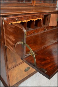 A Georgian 18th / 19th century mahogany secretaire bureau bookcase on chest. Raised on bracket feet having a series of drawers, the top one with fall front and appointed bureau interior. Above a double door astragal glazed cabinet with flared cornice and inlaid dentil. Measures 235cm x 120cm x 59cm.