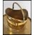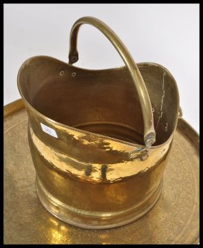 An early 20th century metamorphic brass charger table along with a 19th century Victorian coal scuttle with swing handle atop. The ebonised folding legs holding the brass charger decorated with geometric patterns and medallions.