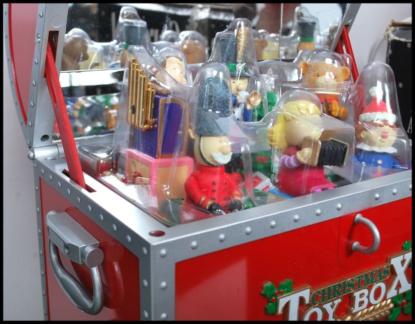 A group of three boxed Christmas toy displays to include a Classic Christmas Carousel animated Christmas display, a Musical Holiday Carousel and a Maisto Christmas Toy Box. All in original boxes.