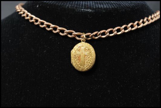 A hallmarked 9ct gold Albert chain having a claw clasp with an 18ct gold tested locket pendant. Each link stamped 375. Weighs 22.2 grams.