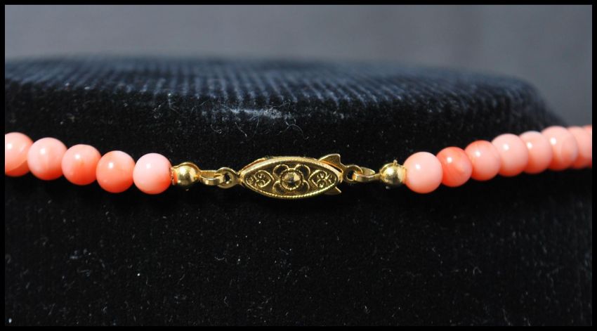 A vintage angel skin coral necklace. The necklace of graduating form each bead carved and strung set to a gilt barrel clasp. Measures 18 inches long.