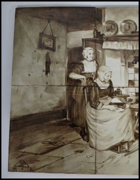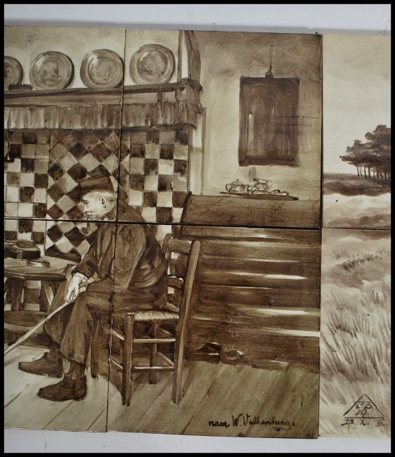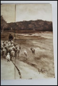 A collection of twelve dutch painted tiles, the tiles consisting of two sets of six each forming a picture, one of sheep on with shepherd on a hillside and the others of a domestic scene. Both sets signed please see images. Measures 39cm x 25cm x 12cm.