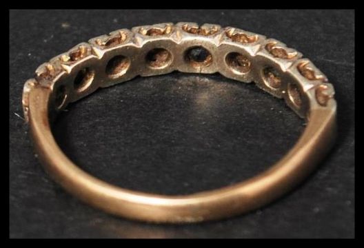 A vintage mid 20th century hallmarked 9ct gold seven stone diamond and sapphire ring. The diamonds and sapphires set in an alternating fashion. Bearing hallmarks for Birmingham 1954. Weighs 2.2 grams size M.