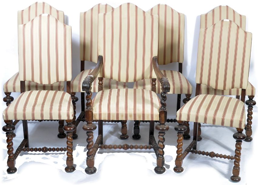 A set of 7 19th century Victorian rosewood dining chairs. Raised on barleytwist rosewood carved legs with squat pad oversized feet united by stretchers. Above are regency stripe overstuffed seat and back rests. The set comprising 1 carver and 6 standard chairs
