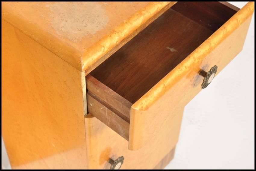A pair of 1930's Art Deco birds eye maple bedside cabinet lockers. Each raised on a plinth base with locker cupboard and single drawers above. Measures 65cm x 35cm x 32cm.