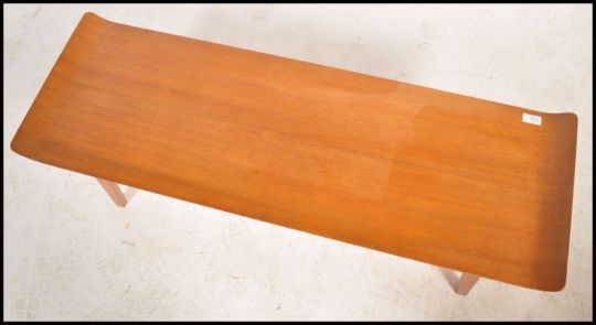A Vintage retro teak wood mid century coffee table raised on shaped legs with under mag shelf, the top with raised flip up edges. Measures 39cm x 112cm x 38cm.