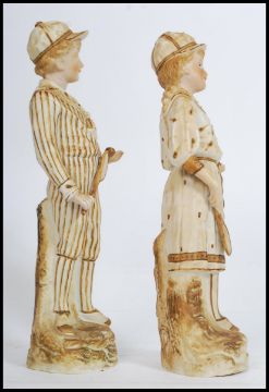 A figural group of 2 early 20th century continental bisque slip moulded tennis figures, one a boy, the other a girl both in period attire. Measures 33cm high.
