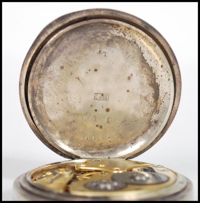 A vintage 20th century silver pocket watch stamped 835 to interior. The enamel face having a roman numeral chapter ring with faceted gilt hands and subsidiary seconds dial. Crown winder to top.