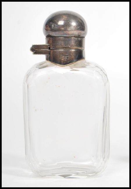 A silver and cut glass double ended perfume phial along with another silver topped perfume scent bottle with lift up clasp. Measures 11cm long.