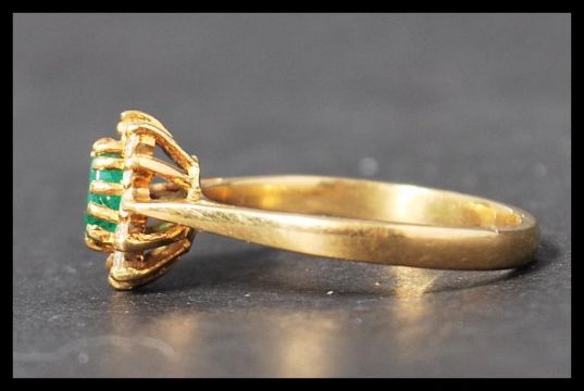 A hallmarked 18ct gold emerald and diamond cluster ring having a central oval cut emeralds surrounded by a halo of 2pnt diamond. Weighs 2.4 grams size L.5.