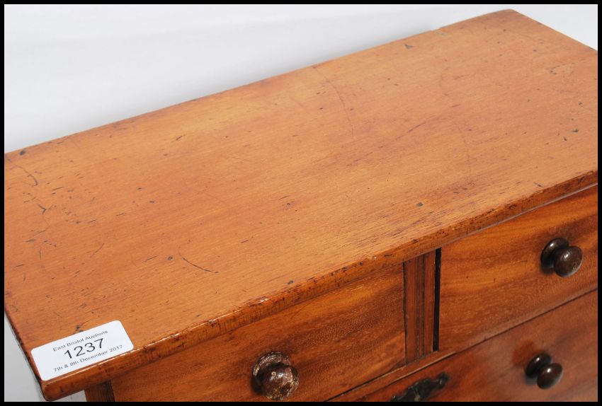 A 19th century Victorian mahogany miniature chest of drawers apprentice / salesman's  piece. The bank of two over three drawers having knob handles with bat wing escutcheons. Measures 40 cm high, 39 cm wide and 20 cm deep.