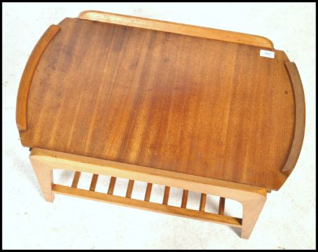 A good mid century coffee table with under magazine rack and tray edge table top above all being raised on angular tapering supports. Measures 44cm x 71cm x 44cm.