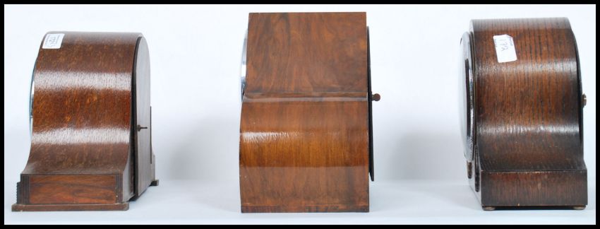 A group of three vintage 20th century wooden cased mantle clocks to include a walnut cased inlaid clock of sloped form, a Kemp Bros example and another. Highest measures 22 cm, widest measures 35 cm and deepest measures 15cm.