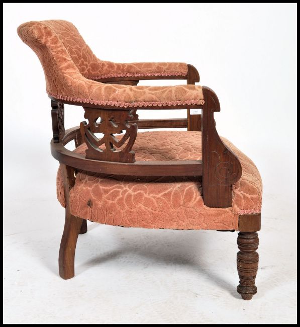 A late Victorian mahogany tub chair - armchair being raised on turned legs with overstuffed seat and back rest with pierced gallery surround. Measures 68cm x 64cm x 66cm.