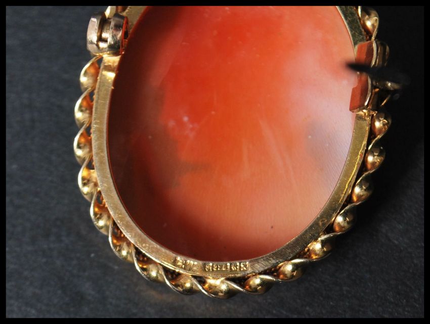 A hallmarked 9ct gold shell cameo brooch with maiden facing left with pin to verso. Weighs 6.7 grams.