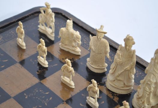 A 19th century Chinese - Canton carved ivory chess set in natural and stained red colourway complete with the black chinoserie decorated chess board box. The set with well carved figures including knights on horseback and castles mounted on elephants etc ( the set being within the vendors family for over 70 years ). Measures 48cm wide x 25cm high.