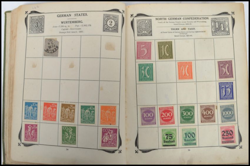An early 20th century stamp album to include many examples, British to inc red penny's, British possessions, German, Irish Free State, Hong Kong, Sweden, Holland and many more. Measures 21.5 cm high and 17 cm wide.