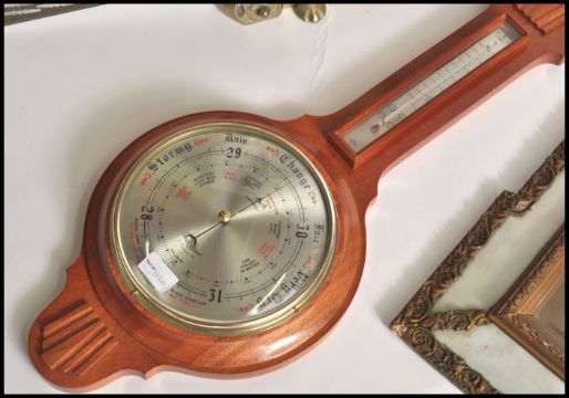 A 20th century peacock folding brass firescreen with finial top together with a Shortland banjo barometer with silvered dial and a gilt and faux marble wall / overmantel mirror