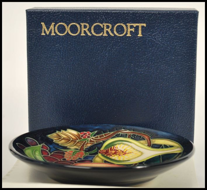 A Moorcroft ceramic pin tray coaster plate of circular form tube lined decorated with flowers in the Queens Choice pattern complete in original box C2000 fountain pen marks and signatures to verso. Diameter 12cm.
