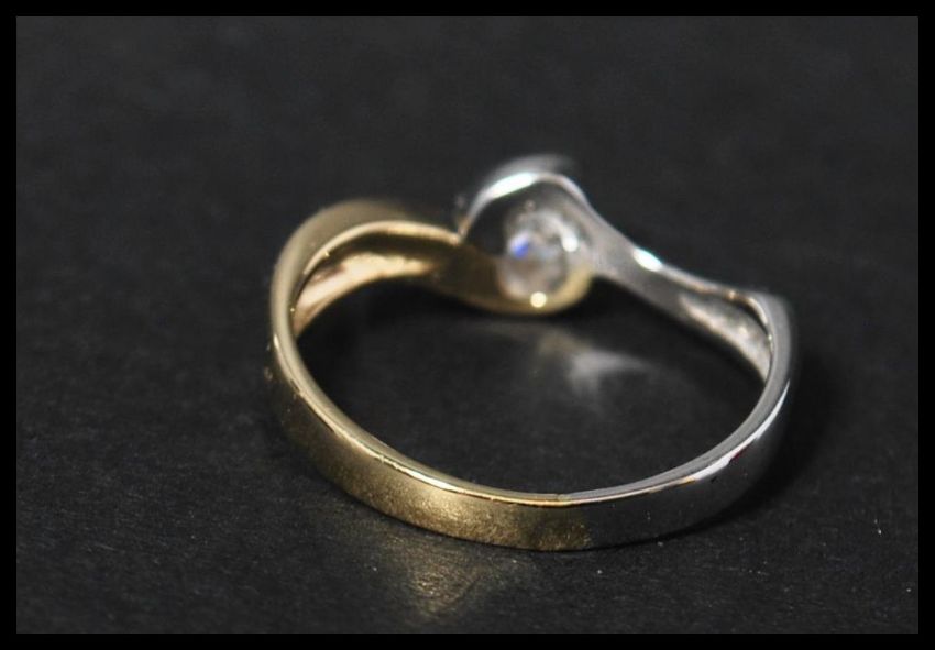 An 18ct white and yellow gold solitaire diamond ring having a single diamond in a contemporary crossover bezel setting. Diamond approx 20pts. Market 750 18KT. Weight 3.9g. Size O.5.