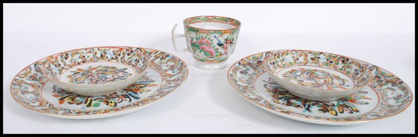 A 19th century Oriental Chinese porcelain cup decorated in poly chrome colours along with four 19th century Chinese plates. Largest measures 21.5cm in diameter.