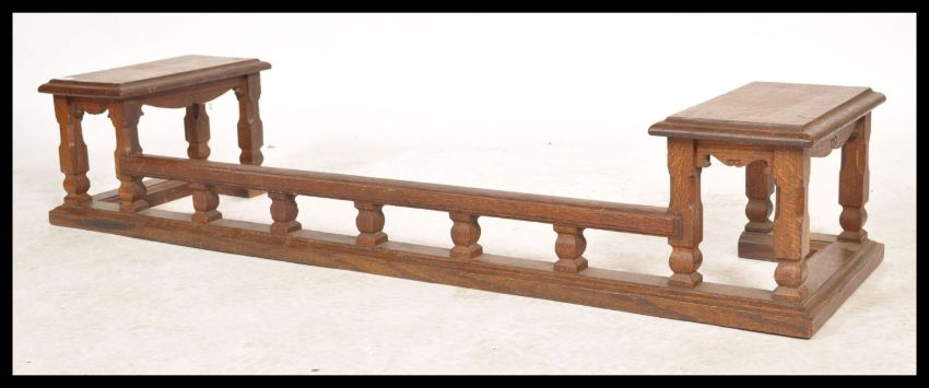 A 19th century solid country oak club fire fender. The kerb with plinth base and top, gallery to centre with panel seats to either side. Measures 102cm x 33cm.