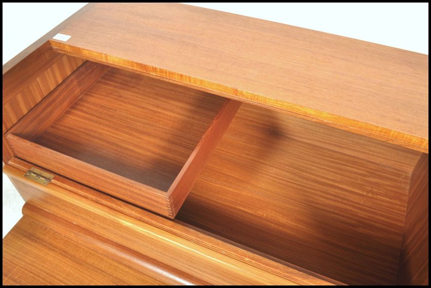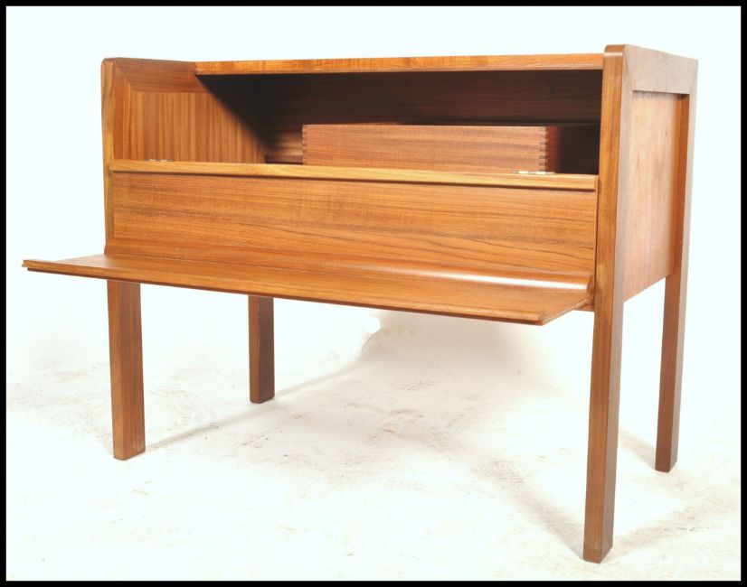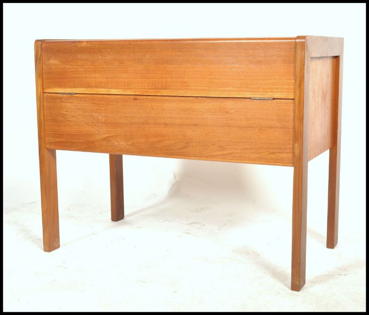 A vintage mid century Dansh drinks - cocktail cabinet with flip over lid, sliding inner tray and detailed box section legs. Measures 73cm x 92cm x 50cm.