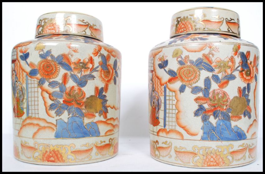 A pair of large 20th century Chinede ginger jars decorated in an Imari style pattern. Each of large cylindrical form with lids, unmarked to the base. Measures 31cm high.
