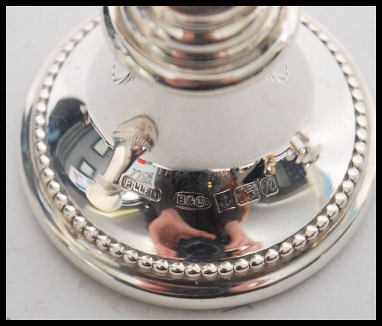 A collection of silver hallmarked items to include place name stands ( two pairs ) and two silver wine bottle stoppers, one with a cork base and the other glass. Highest measures 7 cm.