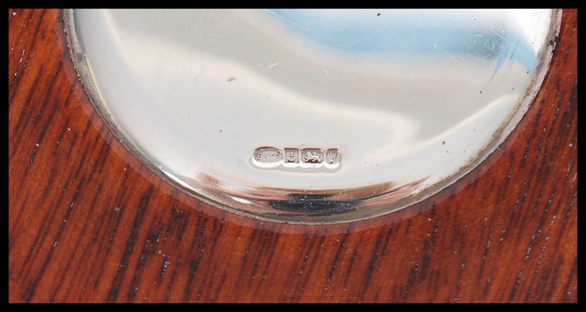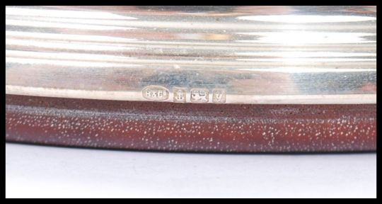A large contemporary silver hallmarked W I Broadway & Co silver and  turned wood wine coaster. Turned mahogany base,  Birmingham assay, makers mark, bating to 1998 Total weight 332g.  Measures 17.5cm across.