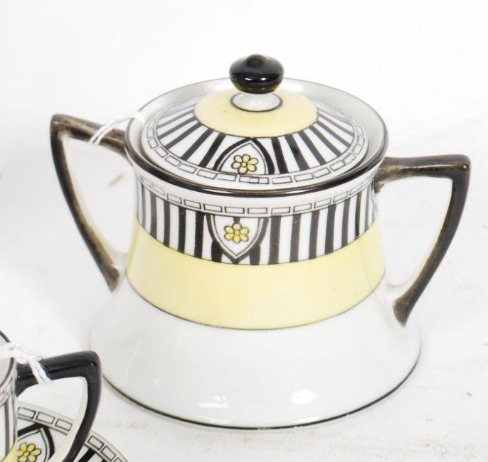 A vintage 20th century Noritake Coffee service in an Ar Nouveay style consisting of five coffee cans, six saucers, coffee pot, creamer and lidded sugar bowl, all stamped to base. Measures 18cm high.