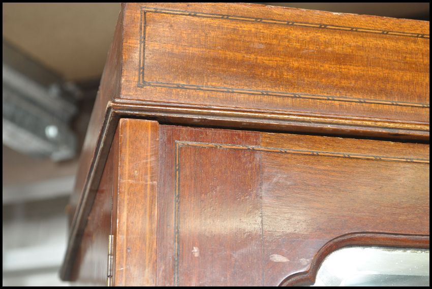 An Edwardian mahogany inlaid triple wardrobe compactum. Raised on a plinth base with mirror door wardrobes flanking a central chest with linen cupboard. Flared cornice atop. Measures 205cm x 182cm x 53cm.