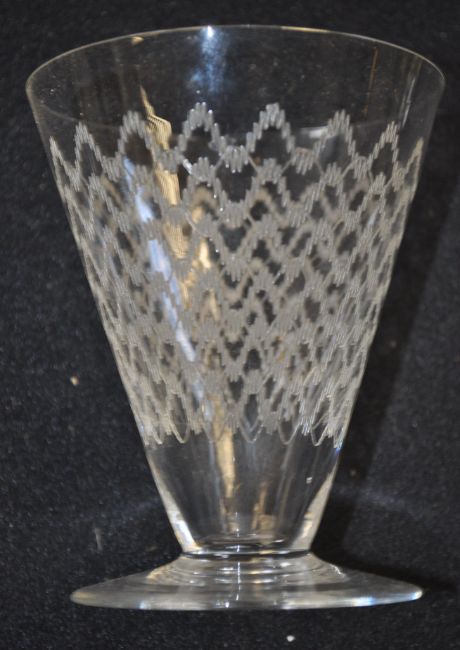 An exceptional set of French drinking glasses dating from the 1920's to include a set of low form champagne glasses, 7 wine glasses, 10 small aperitif glasses and 10 more slightly larger aperitif glasses. All with stunning chevron etched design. Measures 10cm wide x 8cm high.