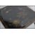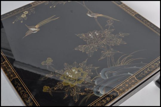 An Oriental Chinese black lacquered low coffee table depicting scenes of flowers and birds with gilt detailing and Greek key border. Measures 41cm x 91cm x 91cm.