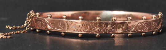 A hallmarked 9ct gold bangle bracelet having a half engraved design with ball finials to top and bottom. Hallmarked for Birmingham weighs 9.7 grams.