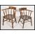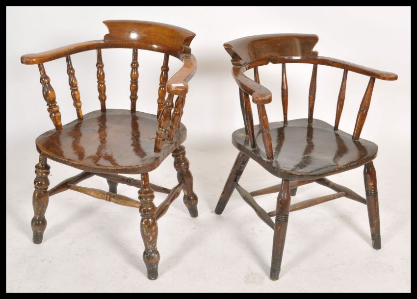 A pair of antique style Windsor - smokers bow armchairs being raised on turned legs united by stretchers with saddle seats and gallery back rests. Measures 75cm x 64cm.